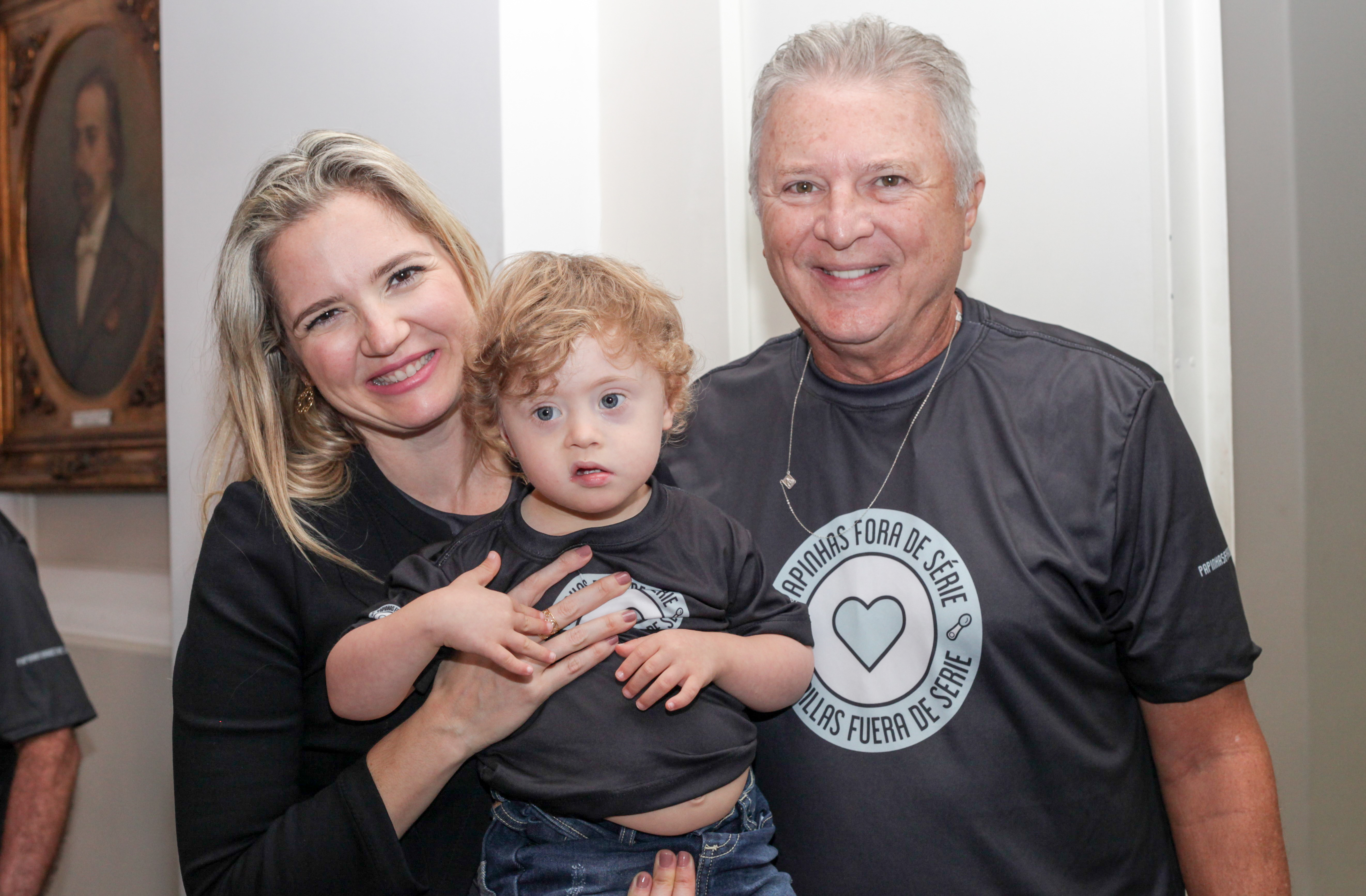 Paulo Alexandre Barbosa com a camisetinha do evento, um presente para o seu filho, e Marcela Fonseca