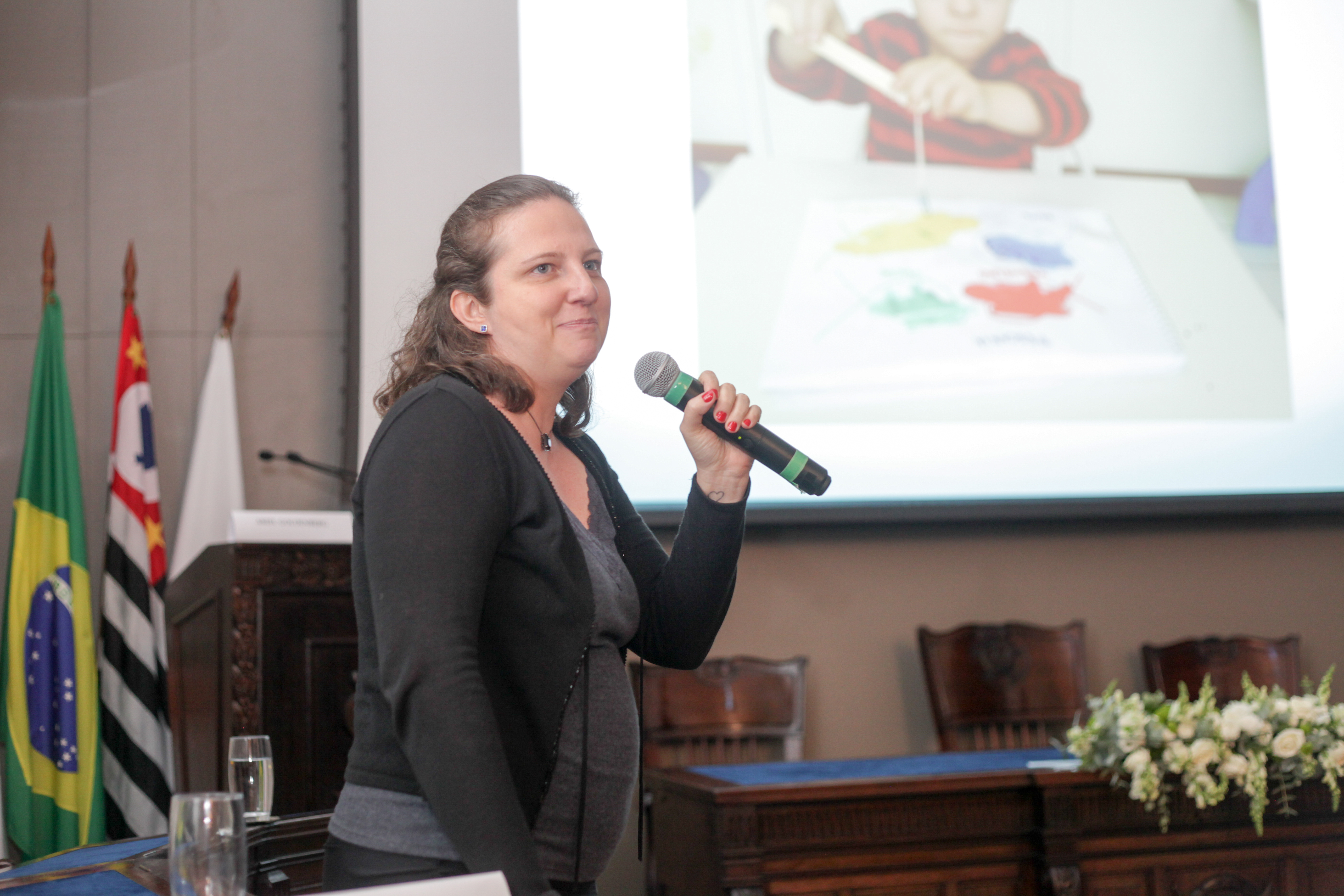 Quem deu abertura para a mesa foi a Valeria Mondin Alabarse, fonoaudióloga clínica pela FMUSP, mestre em ciências pela FMUSP, fonoaudióloga clínica no CEPEC-SP, especialista em síndrome de Down pela UNAES e CEPEC-SP. Em sua apresentação utilizou vídeos e técnicas de alfabetização das crianças com T21, contando o passo a passo do processo de aprendizado, falando sobre a importância dessa relação personalizada para o aprendizado e consolidação do aprendizado pela criança.