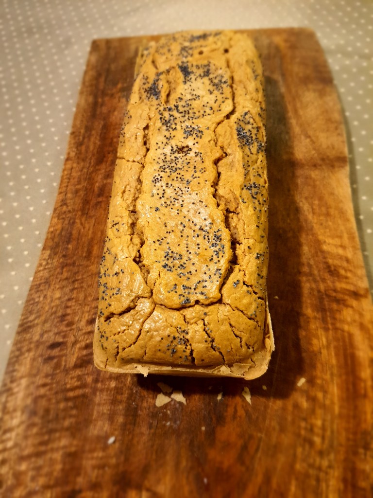Bata tudo no liquidificador e despeje em uma forma de pão (em formato de bolo inglês). Pode ser de silicone (não precisa untar) ou unte uma forma comum e despeje a massa.