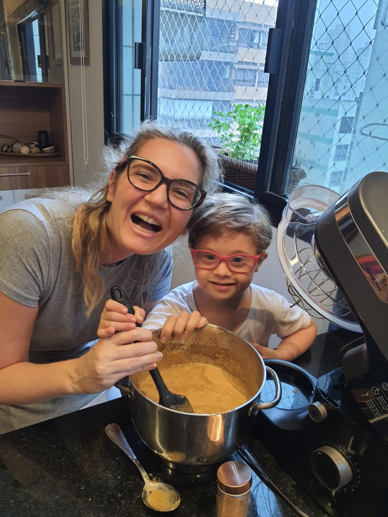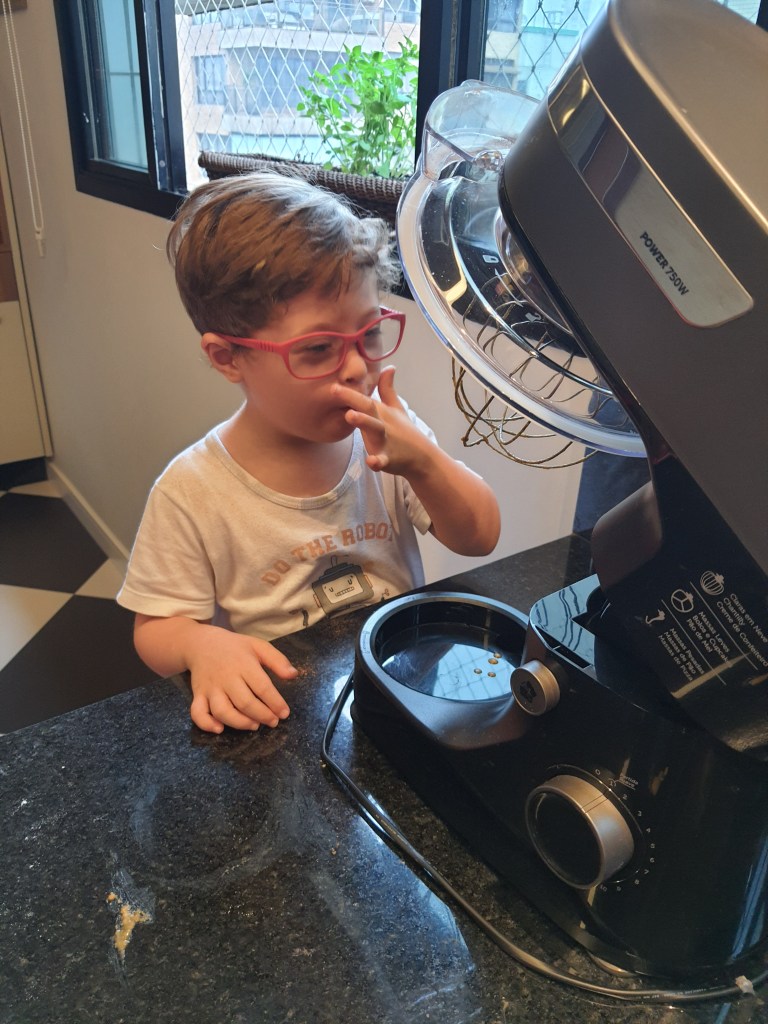 Como verá, a receita não tem glúten, lácteos ou mandioca. Cuidado com os mix de farinhas sem glúten, porque eles sempre levam, em sua composição, fécula de mandioca, farinha de mandioca ou polvilho, farinhas que devemos evitar para cozinhar para pessoas com T21 por causa da tendência ao hipotireoidismo.