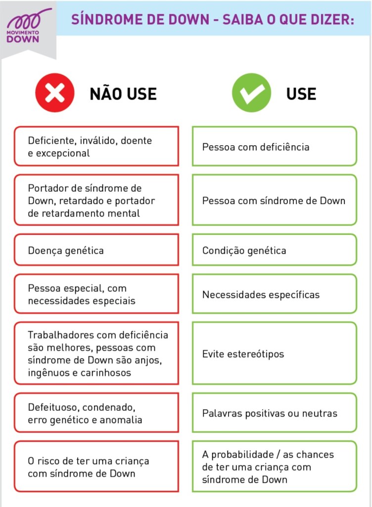 Além disso, não generalize, utilizando o plural, “eles” ou “os Down”. Com que propriedade você pode afirmar que todas as pessoas com T21 são gulosas? Ou anjinhos? Ou todos carinhosos? Não se trata de uma raça diferente, ao contrário, somos todos humanos, vale lembrar. É sinônimo de respeito.